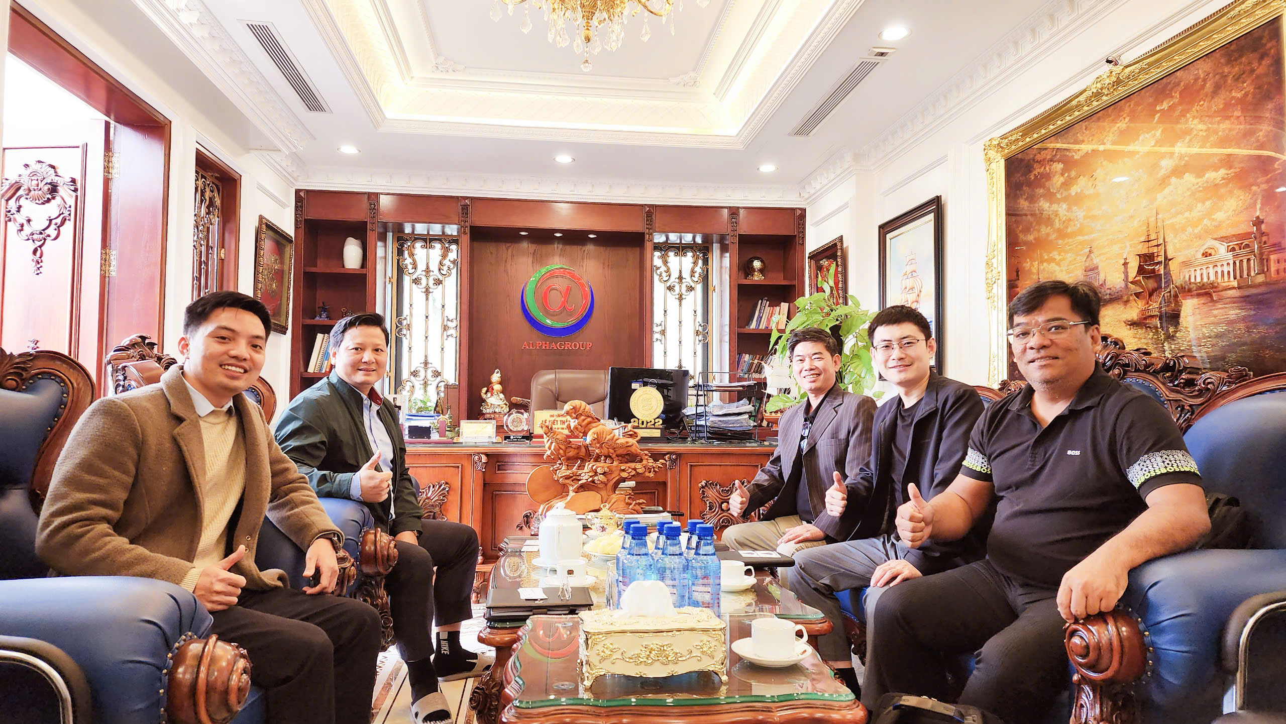 Mr. Le Viet Thang – Chairman of the Board of AlphaGroup and Director of AirZone Group (far left in the photo), together with AQUA representatives: Mr. Dung – Product Manager (far right), Mr. Zhang Bin – Product Manager (middle right), and Mr. Huy – B2B Sales Manager (inner right), met and exchanged ideas at the AlphaGroup office.